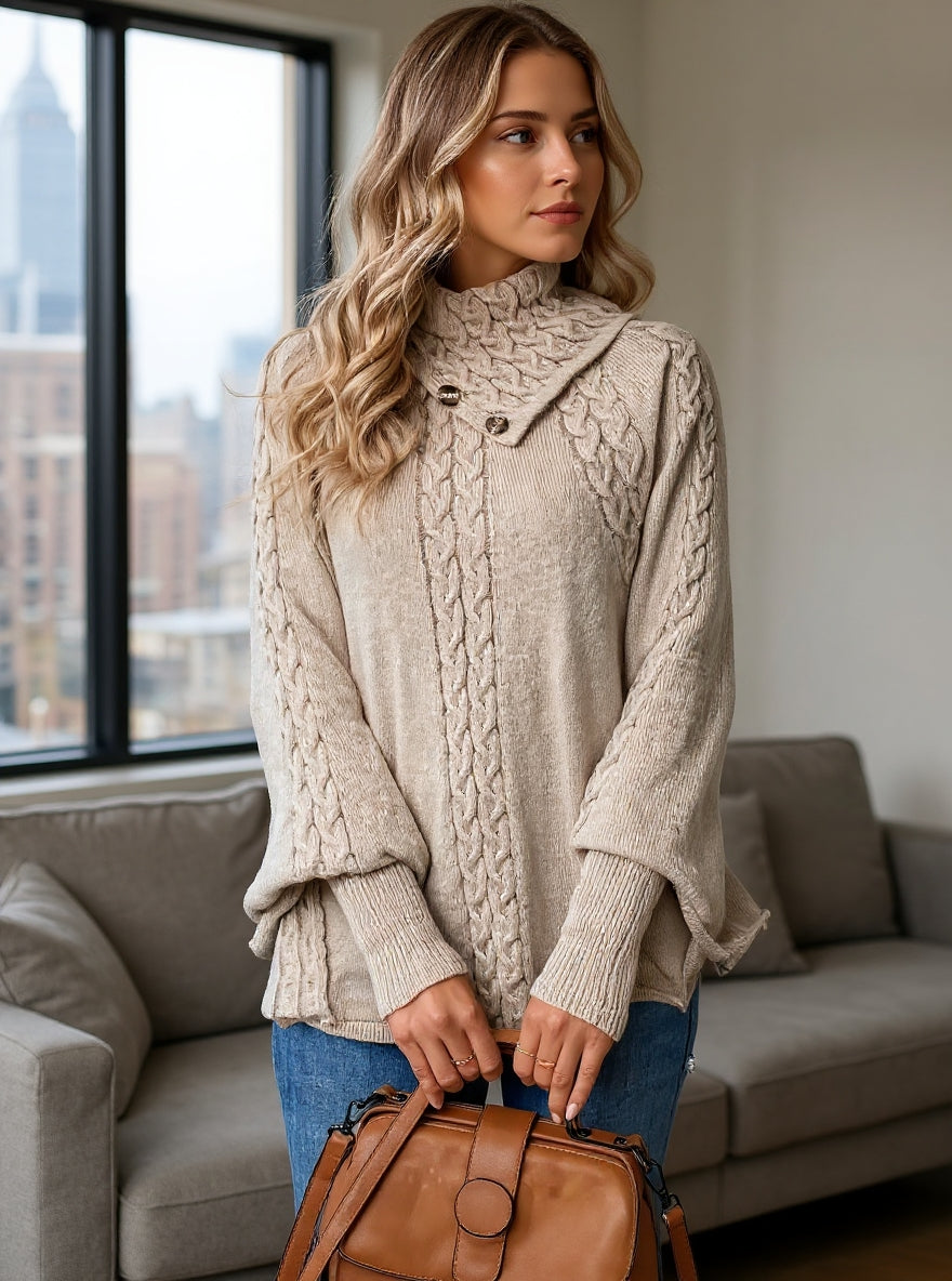 Featuring a stylish buttoned high collar and a comfortable relaxed fit, this sweater offers the ideal blend of warmth, softness, and effortless elegance. Perfect for cooler days when you want to stay cozy while still looking polished.