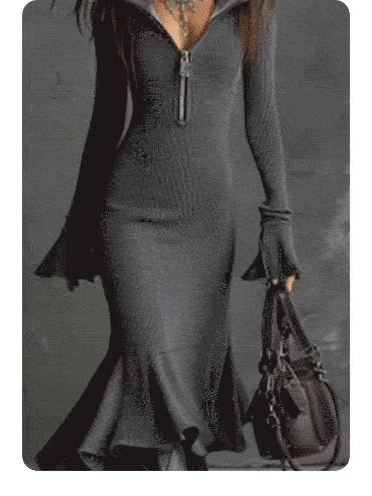 The collar gives the design a structured, refined touch, while the bell sleeves create a feminine silhouette and graceful movement. The fishtail neckline completes the look, subtly enhancing the figure with elegance.